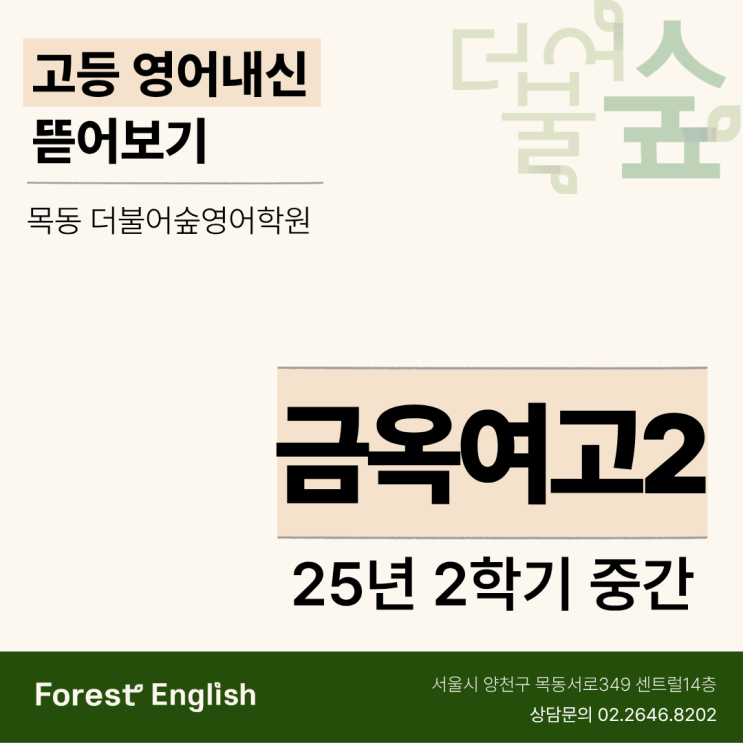 안녕하세요. 목동 더불어숲영어학원입니다. 오늘 게시글에서는 2025년 2학기 금옥여고 2학년 영어 중간고사 전체 리뷰를 통해 학생들이 실제로 어려움을 느낀 지점이 어딘지, 앞으로 보완해야 할 학습 방향을 정리해드립니다. 학생들의 시험 결과를 보면 비슷한 준비를 했다고 생각했던 학생들 사이에서도 점수 차이가 분명하게 나타났습니다. 어디에서 시간이 부족했는지, 어떤 유형에서 반복적으로 실수가 나왔는지, 서술형에서 왜 막혔는지를 정확히 짚고 넘어가야 다음 시험에서는 같은 문제가 반복되지 않습니다. 이번 분석에서는 점수에 직접 영향을 준 부분과 다음 내신은 어떻게 준비해야 하는지에 집중해서 설명드리겠습니다. 25-2....... <img src="https://blogthumb.pstatic.net/MjAyNjA0MDdfMjkw/MDAxNzc1NTYyNTg4OTk2.RR3bkKRPLRGUXyavgm65-2NDuQ1N7al4cb_eCrHFwwkg.wPRVwz-jeFBtDmtljW2acY_itml75dNVWbYDhq_ZxkUg.PNG/%B3%BB%BD%C5%BA%D0%BC%AE_%2815%29.png?type=s3" />