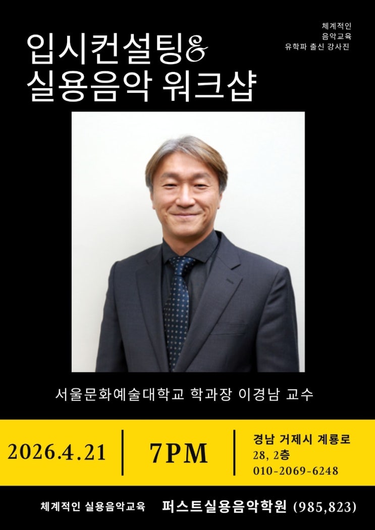 [교육/입시] 실용음악 입시의 본질을 묻다: 서울문화예술대학교 이경남 학과장 초청 컨설팅 안녕하세요. 퍼스트 실용음악학원입니다. 입시라는 냉정한 현실 앞에서 자녀의 재능이 어느 정도인지, 그리고 어떤 길을 가야 할지 고민하시는 학부모님들의 마음을 깊이 공감합니다. 특히 지역적 한계로 인해 수도권 대학의 최신 입시 트렌드와 교수진의 직접적인 피드백을 접하기 어려웠던 분들을 위해, 어렵게 귀한 자리를 마련했습니다. 현 서울문화예술대학교 실용음악학과 학과장이신 이경남 교수님을 모시고, 본원에서 실전 입시 컨설팅과 워크숍을 진행합니다. ■ 왜 이경남 교수님인가: '필드의 전설'이 말하는 입시의 정답 실용음악....... <img src="https://blogthumb.pstatic.net/MjAyNjA0MTZfNTAg/MDAxNzc2MzIwOTY1NzAy.2FJJnNNCzcC6AK3ZrNjcRYKvAT4-4hXgJhzu5VYqvusg.C4TapCavVTQazR9tOI20axu-uhZJ_EQk5SguXL7n1qMg.JPEG/900_1776308197619.jpg?type=s3" />