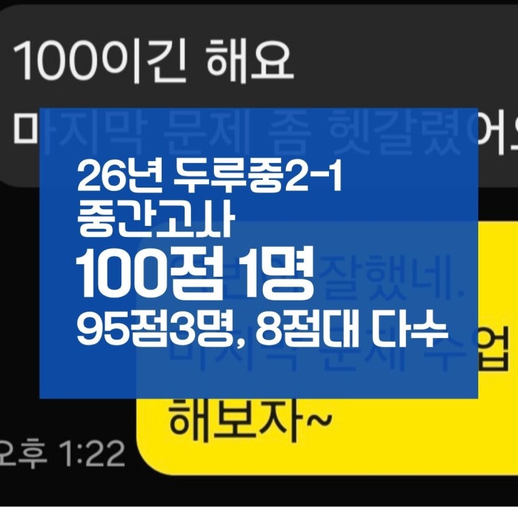 26년 중2-1 두루중 중간고사 결과 100점 1명, 95점 3명, 80점대 3명입니다. 또한 작년 마지막 겨울까지 함께 했던 중3 남자 친구 현재는 고1이 된 학생에게서 연락이 왔습니다. 이번 고등학교 중간고사 수학 성적이 반에서 1등을 했다고 합니다. 얼마나 이쁘던지요^^ 고1-1 중간고사 반 1등 학생 다음 시험에는 전교 1등 하렴~~♥️ 학생들이 시험이 끝나면 시험 결과를 톡으로 점수와 함께 시험지를 보내줍니다. 그러면 어떤 문제가 어려워 틀렸는지, 어떤 부분에서 실수한 건지에 대한 분석을 하게 되는데요. 이번에 95점짜리가 많이 나온 이유는 마지막 문제에서 많이 틀렸습니다. 우선 마지막 문제가 한 번에 바로 풀리는 문제가 아니어서 식....... <img src="https://blogthumb.pstatic.net/MjAyNjA0MjhfMjgy/MDAxNzc3MzcxODgzMTgy.u0Os7hkHOx9ivIUeZUe4HxiMoSXsez84Jdu5-jdFq-Ug.geAu_FBTpKqvAjXR6ChFMEzF3EuXSoGmaw520RfYsy0g.JPEG/%B5%A5%C4%AB%B8%A3%C6%AE%C7%D0%BF%F8_%C6%AF%C0%E5%C1%A1%C0%BA%BF%E4..jpg?type=s3" />