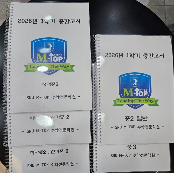1학기 중간고사 준비가 막바지입니다. 시험준비 막바지에는 학교별 교과서, 프린트, 기출문제 풀이와 개별 오답시험에 집중하게 됩니다. 진행중에 개별로 부족한 파트별 문제도 추가로 집중합니다. 이번 중학교 시험 범위는 중학교 3학년은 모두 동일하고, 중학교 2학년은 장덕중, 성덕중, 하나중, 신가중, 진흥중 등 범위가 조금씩 차이가 있습니다. 2학기 과정이 함께 출제됩니다. 학교별 시험교재가 필수입니다. 엠탑에서는 사전에 파악된 시험 범위로 학교별 시험 교재를 제작, 배포하고 있습니다. 2. 시험 기간에는 개별 오답시험을 진행합니다. 시험기간에는 다양한 문제를 난이도별로 풀이합니다. 그만큼 오답 정리가 중요합니다. 3. 시험....... <img src="https://blogthumb.pstatic.net/MjAyNjA0MjJfMjg4/MDAxNzc2ODQyOTI4ODMw.Ha3zh0BfC8SzDDQ42qHuaCuAx4QznfMIApL7NqSeRN4g.f4foPVTUIyycFbkLCpyv7eOYKBBbOlK6V7osTm6dE5wg.JPEG/%C7%D0%B1%B3%BA%B0_%BD%C3%C7%E8%B1%B3%C0%E7.jpg?type=s3" />