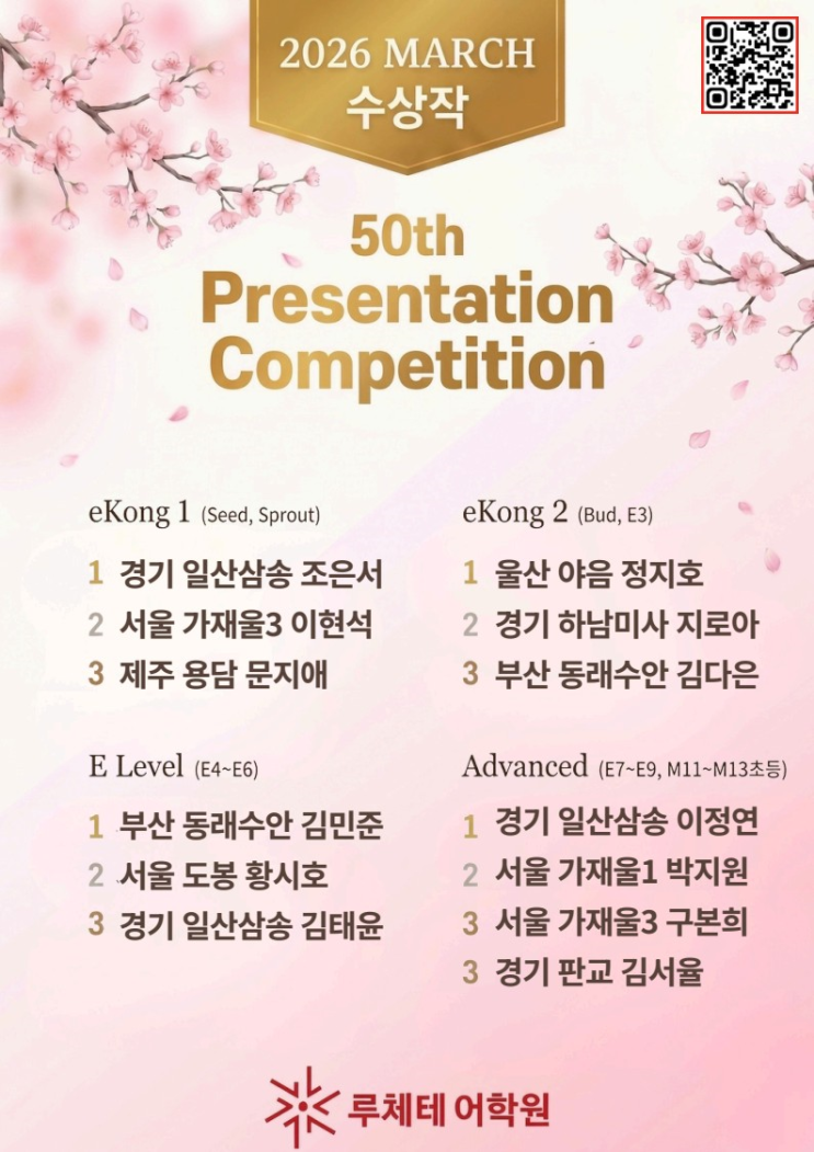 안녕하세요~ 2026년 3월에 진행된 루체테 영어 프레젠테이션 대회에서 좋은 성적을 거두어 입상 소식을 전하게 되었습니다~~!! 열심히 노력한 만큼 좋은 결과를 받게된 친구들에게 칭찬의 박수를..!! Advanced 1위 이정연 E level 3위 김태윤 eKong 1 1위 조은서 함께한 루체테메이트 모두모두 고생 많았습니다. 앞으로도 함께 격려하고 성장하는 친구들이 되길 바랍니다~ 루체테 영어 프레젠테이션 대회는 전국 루체테캠퍼스 친구들과 함께 실력을 자랑할 수 있는 좋은 기회랍니다:) 격월로 진행된다고 해요..!!(속닥속닥) 말하기에 자신감을 가지고 쑥쑥 성장하는 루체테어학원은 언제든지 루체테메이트들을 환영합니다~!! *일산삼송캠퍼스 입....... <img src="https://blogthumb.pstatic.net/MjAyNjAzMzFfMjg1/MDAxNzc0OTM0NTI5NTgw.gYYoN_SSJidchNQHQJ_wWpMGu7d0OG48cF_-kos8HYMg.d0xXIgB06LSa1ISQuJxdLVBPyOg-Uufh1PnAP48ApM0g.PNG/image.png?type=s3" />