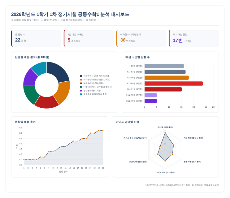 출제경향 및 난이도 분석 구리여자고등학교 1학년 │ 2026.04.22 시행 │ 선택형 20문항 + 논술형 2문항 ▶ 한눈에 보는 시험 개요 이번 시험은 22문항 100점 만점으로, 선택형 20문항(90점)과 논술형 2문항(10점, 부분점수 부여)으로 구성되었습니다. 고1 첫 정기고사이라는 점에서 학생들이 가장 긴장하는 시험으로, 중학교 수학과 가장 큰 차이는 복소수·항등식·근과 계수의 관계라는 새로운 개념의 등장입니다. 배점은 4.0점부터 시작해 5.1점까지 0.1~0.3점 단위로 정밀하게 차등되어 있어, 한 문제 차이로도 등급이 바뀔 수 있는 구조입니다. 이차함수·이차방정식 단원이 36점으로 가장 큰 비중이며, 복소수(18점)와 다항식(16점)이 그 뒤....... <img src="https://blogthumb.pstatic.net/MjAyNjA0MjhfMjc1/MDAxNzc3MzU3ODE5NTk0.ve5hL5E0LT2bFP70kpHtqGNdEV5rKbDBgZdbQvaT3fQg.mz2AzKGhGsDzHVSSfxQFYbRrJY9r5x8sh2qTAeILcqcg.PNG/dashboard.png?type=s3" />
