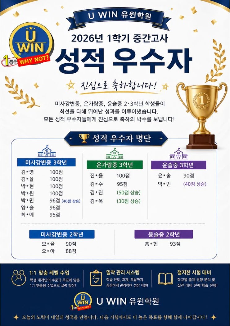 [미사영어학원/유윈학원]2026년 1학기 중간고사 영어 성적 우수자