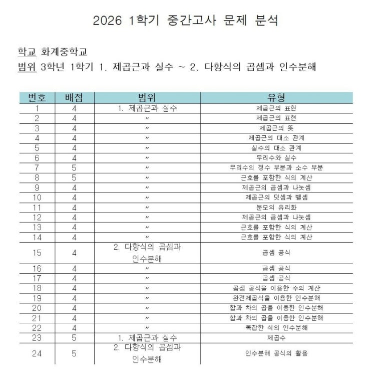 2026년 1학기 중간고사 시험 분석 화계중학교 3학년 수학 안녕하세요, 엔젤영어수학입니다 이번 화계중 3학년 1학기 중간고사 수학 시험을 철저히 분석해보았습니다. 시험 범위 1단원: 제곱근과 실수 2단원: 다항식의 곱셈과 인수분해 전형적인 중3 1학기 핵심 단원 구성으로, 기초 개념 + 계산력 + 응용력까지 모두 요구된 시험입니다. 전체 난이도 및 특징 ✔️ 중상 난이도 ✔️ 단순 계산보다는 개념 이해 + 정확한 계산력 중심 ✔️ 인수분해 파트 비중 높음 (후반부 집중 출제) 특히, 초반: 제곱근 개념 확인 중반: 계산 및 응용 후반: 인수분해 심화 점수 격차를 만드는 구조였습니다. 단원별 출제 분....... <img src="https://blogthumb.pstatic.net/MjAyNjA0MzBfMiAg/MDAxNzc3NTUzOTAxNjA0.dw2-4kVgVD687etE0Wv_7Y49BnX6U5-DyZYzhS5yrgYg.szP6hC7kyg-f4qsa68gl3DgyLAQYXKwSCjSXLeXuUJMg.JPEG/900_1777553901174.jpg?type=s3" />