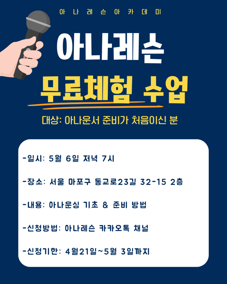아나레슨이 아나운서를 처음 준비하시는 분들을 위한 무료체험 수업을 준비했습니다. 무료체험 수업은 매달 열리는 게 아니라 이후 일정은 예정되지 않았습니다. 신청하실 분들은 서둘러서 신청해 주세요! 막연하게 "해보고 싶다"는 생각만 있었던 분들, 어디서부터 어떻게 시작해야 할지 고민이셨다면 이번 기회에 직접 경험해 보세요~ ✔아나운싱 기초 ✔실제 준비 과정과 방향성 ✔올바른 준비 방법까지 대상: 아나운서 준비가 처음이신 분 일시: 5월 6일 저녁 7시 장소: 아나레슨(서울 마포구 동교로 23길 32-15 2층) 마감: 4월 21일~5월 3일까지 처음이 가장 어렵고 막연한 만큼 꼭 도움이 될 내용을 준비했습니....... <img src="https://blogthumb.pstatic.net/MjAyNjA0MjFfOTQg/MDAxNzc2NzUwNjU4OTUw.SZuF4ef1uOhNQveEIZ-y7H3J6aeTp24KCW5dOhEs1pAg.0W6unbatefBxBVrNhD50S4DSvGCguJwBs7noba_jOPUg.PNG/%B9%AB%C3%BC%BC%F6_%B8%F0%C1%FD__%282%29.png?type=s3" />