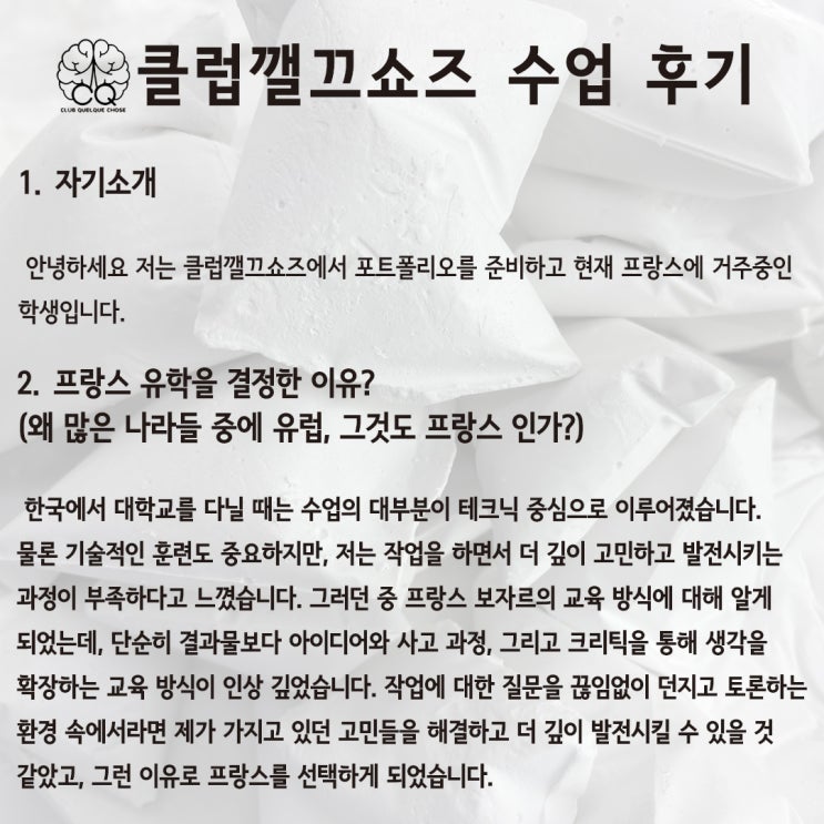 프랑스 순수미술 편입학 준비생_정O경 학생 포트폴리오 수업 후기 :: 프랑스미술유학 포트폴리오학원 클럽깰끄쇼즈