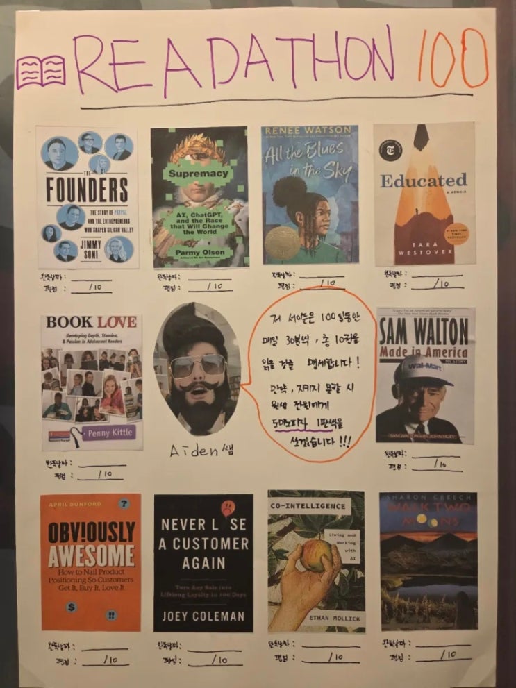 안녕하세요! 마포 대흥동영어학원 에이든 영어 에이든 원장입니다. READATHON 100 2기 곧 시작합니다. 이번 2기에서는 각자의 스타일대로 포스터를 만들어 보기로 했는데요! 그래서 어제 저도 한번 만들어봤습니다. 먼저 읽을 책 10권을 정하고, 표지를 출력하고, A2 용지에 배치하고 개발세발 데코?도 해봤어요 ㅎㅎ 그리고 마지막으로 게시까지~~~!!! 타이틀 쓰면서 조금 망하긴 했지만, 여튼 완성~~~!!! 학원 복도앞에 게시하고 나니깐 엄청 뿌듯하고, 기대도 되고, 조금 긴장도 되더라구요. 우리 에이든 친구들도 비슷한 심정이겠죠? 전 이번 챌린지에서 100일 동안 총 10권을 읽어보려고 해요. AI, CEO 스토리, 브랜딩, 고객경험....... <img src="https://blogthumb.pstatic.net/MjAyNjA0MDhfMTg4/MDAxNzc1NjE2OTk0OTYz.6zMVBthjaqGM2A1NV1c2u1pz1KUDJy649fSmbf084vIg.3B_59inev7EpdSkj6nMnwuNyKP7fx0HAUZhkOL1RWFwg.JPEG/900%A3%DFBandPhoto%A3%DF2026%A3%DF04%A3%DF08%A3%DF11%A3%DF34%A3%DF58.jpg?type=s3" />
