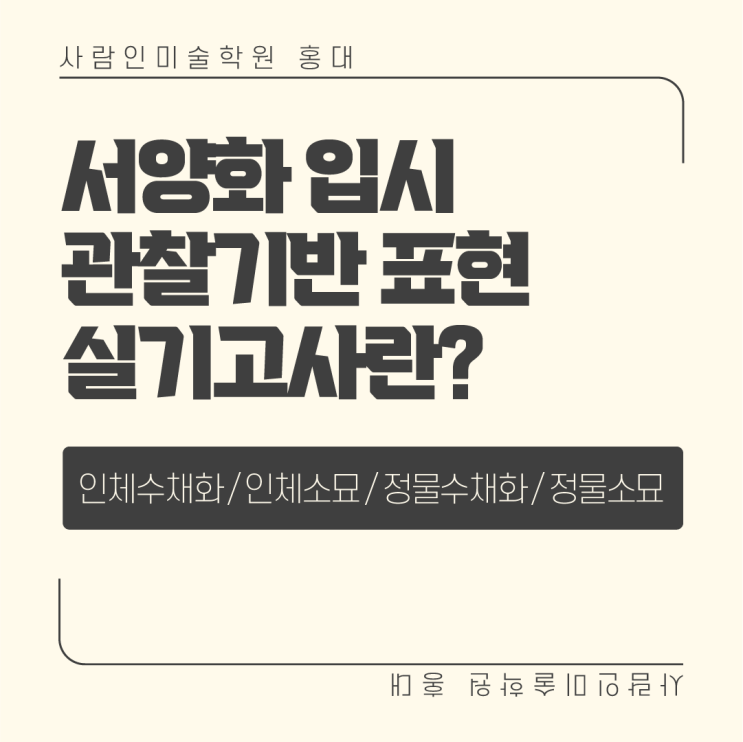 안녕하세요! 홍대 앞 [인체수채화, 인체소묘, 정물수채화, 정물소묘] 전문 사람인미술학원입니다! 미대에서 서양화와 회화 계열의 입시에서 아직 비교적 많은 비율이 관찰 기반 표현이 주된 실기고사입니다 여기서 관찰 기반 표현 실기란, 인체수채화, 인체소묘, 정물소묘, 정물수채화입니다. 이는 말 그대로 대상을 관찰해서 있는 그대로 표현하는 실기고사입니다. 이 관찰표현 실기고사에서 제일 중요한 것이 있습니다. 바로 많은 것을 관찰할 수 있는 힘입니다. 인체수채화, 인체소묘, 정물소묘, 정물수채화는 볼 수 있는 양에 의해 표현력이 좌우됩니다. 보이는 것이 적으면 당연히 표현할 거리도 적은 것처럼 보이는 것이 많아야 그려야 할....... <img src="https://blogthumb.pstatic.net/MjAyNjA0MDhfMjY5/MDAxNzc1NjI4MTUzNDM0.eCCk0iq8DZBthvfDDKK4fTrb2UHgoOeHtmGWzqt9tt4g.UzA9wCzOplZJb8NDUjn0CoECPNJdjz3PuNryrzArJRkg.PNG/%BC%AD%BE%E7%C8%AD_%C0%D4%BD%C3_%BC%AD%BE%E7%C8%AD%C0%D4%BD%C3_%B9%CC%B4%EB_%C0%CE%C3%BC%BC%F6%C3%A4%C8%AD_%B9%CC%B4%EB%C0%D4%BD%C3_%282%29.png?type=s3" />