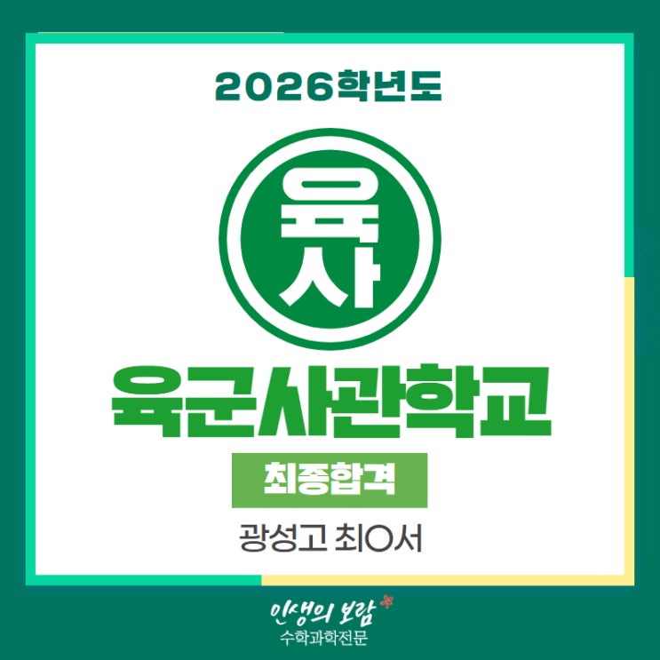 안녕하세요 인생의보람 수학과학 전문학원 본원입니다. 오늘은 또 다른 광성고 출신 학생의 합격 소식입니다! 광성고 최0서 학생의 육군사관학교 합격을 축하합니다. 26학년도 육군사관학교의 경쟁률은 31.5:1로 여타 대학보다도 높은 경쟁률을 띄었습니다. 사관학교들은 매년 심화되는 취업난 속에서 직업 안정성과 낮은 학비로 매년 경쟁률이 높아지고 있는데요, 최0서 학생은 우선 선발 전형에서 자연계를 선택 후 합격하였습니다! 광성고에서 사관학교에 합격하기 위해선 어떻게 해야 할까요? 남학생의 경우, 자연계열이 선발 비중은 높은 반면 경쟁률은 인문계열이 더 치열한 편입니다. 미적분이나 기하를 배운 남학생이라면 자연계열을 선....... <img src="https://blogthumb.pstatic.net/MjAyNjA0MTdfMTE0/MDAxNzc2NDE0NjkzNTk3.9a6FtZoAMOJ5PLEFSbGMO-spoNpZMDHxVlTzlM0zfR0g.LfdvHEhXOyQ00yo50UgOut30BGKWnDnqAwl-w3s12cUg.JPEG/2026_%C3%D6%B9%CE%BC%AD_%C0%B0%B1%BA%BB%E7%B0%FC%C7%D0%B1%B3_%281%29_%281%29.jpg?type=s3" />