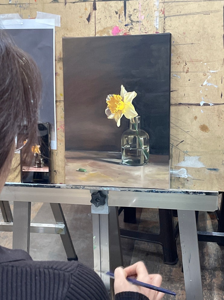 유화를 처음 접하면 “생각보다 훨씬 어렵다”는 반응들이 많습니다. 그런데 흥미로운 점이 하나 있습니다. 소묘 위주로 작업해 오셨거나 색채 경험이 많지 않은 경우, 혹은 직관적으로 밀어붙이는 방식에 익숙한 분들일수록 오히려 유화를 수월하게 받아들이는 경우가 있습니다. 이 차이는 숙련도의 문제도 있겠지만 유화라는 매체를 다루는 방식에서 갈라지는 것 같습니다. 유화의 주요한 성질중에 하나는 빨리 마르지 않는다는 점입니다. 기름을 생각해 보시면 쉽습니다. 식용유를 후라이팬에 둘러 놓고 기다려 보세요. 이 기름은 언제 마를까요? 그래서 유화는 오늘 그렸다면, 오늘은 절대 안마르고요. 내일도 안 마릅니다. 일주일이 지나야....... <img src="https://blogthumb.pstatic.net/MjAyNjA0MTdfMjMz/MDAxNzc2NDE4Mzk0Njc5._-CRkGsdR0eAT5RKYuLlsIetdgX7duVfosOMY6eAjigg.-Z2pZJC6o7V8kgXvfGJO2DyVI6PE_G4jPWaHENa0R_0g.JPEG/IMG%A3%DF2171.jpeg?type=s3" />