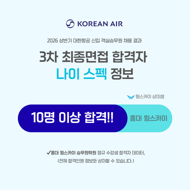 윙스카이 상미쌤입니다. 어제 대한항공 승무원 3차 최종 면접 합격자 발표가 있었는데요. 우리 홍대 윙스카이에서는 10명 이상의 합격자가 나왔습니다!!!!!!! 우리는 작년 상반기 OZ 채용에서도 10명을 훌쩍 뛰어넘는 역대급 합격이 나왔지만, 당시 최합 인원 200명 이상이었던 것에 비해 이번 KE 최합자 150명 내외 예상 → 더욱 높은 합격률 기록 홍대 윙스카이 KE OZ 단일 채용 대거 합격 기록 →2025 상반기 아시아나항공 00명 합격!! →2026 상반기 대한항공 00명 합격!! ※위 공채 모두 30대, 학점 2점대, 무토익, 비전공 등 결코 유리하지 않은 조건의 합격자들 배출! FSC 임원/최종 진출 경험 전무한 합격자가 대부분이었습....... <img src="https://blogthumb.pstatic.net/MjAyNjA0MThfOTkg/MDAxNzc2NDgzMzIzNDMx.ylll0ZcNrvsZ78ObGb99nO3Qg5OlPPTuybM-eWBM4_og.129BadzJ6OJ49-74d4d0bMuZjOIGCZQCc6zDOntOwGEg.PNG/2026_%BB%F3%B9%DD%B1%E2_%B4%EB%C7%D1%C7%D7%B0%F8_%BD%C2%B9%AB%BF%F8_%C3%A4%BF%EB_%C3%D6%C1%BE_%B8%E9%C1%A2_%C7%D5%B0%DD_%C8%C4%B1%E2_%BD%BA%C6%E5_%C5%E4%C0%CD_%B3%AA%C0%CC_%286%29.png?type=s3" />