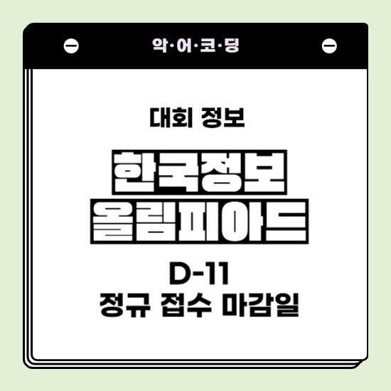 안녕하세요 한 번 물면 놓지 않는다! 대치동 코딩학원 악어코딩입니다 2026년도 한국정보올림피아드 1차 대회가 5월 10일(일) 에 온라인으로 열립니다. 오늘(4월 29일)은 대회 시작 D-11이자, 정규 접수 마감일입니다. 이맘때쯤 되면 이런 질문들이 많이 들어옵니다. "정규 접수 마감이 오늘이라는데, 놓치면 끝인가요?" "작년 1차에서는 어떤 문제가 나왔나요?" "당일 온라인 대회는 어떻게 준비해야 할까요?" 이번 글에서는 위 질문들에 대한 답이 될 수 있도록, 지금 꼭 확인해야 할 일정, 작년 기출 풀이 글, 그리고 당일 환경 체크리스트까지 한 번에 정리해보겠습니다. 대회 정보 한눈에 보기 가....... <img src="https://blogthumb.pstatic.net/MjAyNjA0MjJfMzIg/MDAxNzc2ODI3NjE4OTgw.h8oKDBPsCYp9uBCM9GmVfvcX9Jx3kHfGSp8nV4pgMXEg.YK3rs7NI3kXg5c6sIXD0w2vz2xMcwy8osxirve7yIUYg.JPEG/%BA%ED%B7%CE%B1%D7_%BD%E6%B3%D7%C0%CF-029_%281%29.jpg?type=s3" />