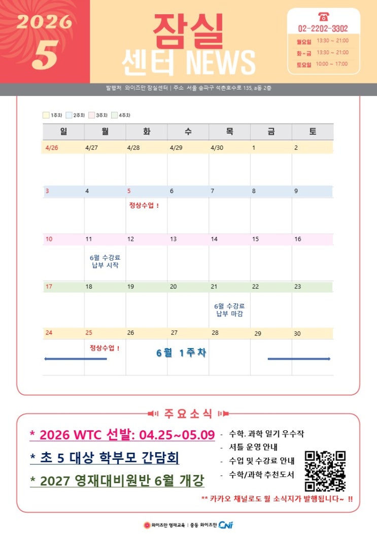 4/20(월)~5/2(토) 2주간의 수업예약이 아래 링크로 오후 6시에 오픈됨을 알려드립니다. ★5/1(금) 노동절은 오전10시-오후6시 오픈합니다. 4시까지 학원에 입실하시면 수업 가능합니다.★ ▶ 학기 중 오픈 시간 평 일 : 오후 1시 ~ 오후 9시 (1, 2, 3, 4, 5, 6, 7 시 일곱 타임) 토요일 : 오전 9시 ~ 오후 3시 (9,10,11,12,1시 다섯 타임) ※ 방문자란에 학생 이름으로 예약 부탁드립니다. 아래 빨간 박스란 클릭하시면 방문자 학생이름 입력란이 나옵니다. (네이버 회원 이름이 학부모일 경우 방문자란에 반드시 학생 이름 기재) ※ 형제일 경우 두 학생 이름 모두 기재 (수량을 2로 예약) ※ 2시 예약하시고 2시20분에 보내주시는 경우, 학생이.......