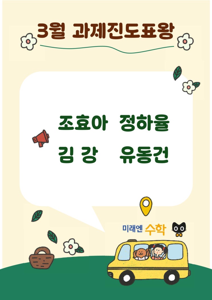 안녕하세요! 삼성영어 미래엔수학 삼전학원입니다. 새 학기가 본격적으로 시작된 3월, 설렘과 긴장이 함께하는 시기였는데요~~ 학년이 바뀌고 학습 환경도 달라지는 중요한 시기 속에서도 우리 아이들은 언제나 그렇듯이 최선을 다해주었습니다! 오늘은 3월 과제진도표왕의 우수 학생들을 소개해드리며, 자기 목표를 끝까지 실천해낸 우리 학생들의 노력과 성장을 함께 나눠보려 합니다 미래엔수학 3월 과제진도표왕 수상자 발표 방학 동안에도 스스로 계획을 지키며 꾸준히 학습을 이어간 우리 학생들, 자랑스럽고 기특합니다 ♡ 이번 3월 역시 약 한 달 동안 기존과 동일하게 공정하게 평가를 진행했으며, 다음 네 가지 핵심 항목을 중심....... <img src="https://blogthumb.pstatic.net/MjAyNjA0MTVfODAg/MDAxNzc2MjM2ODQ2MjI2.1S_I5VuDWKpd3itaWN8-gBYITTu2PRPhYNrbzgIGCW0g.vkEOaHXlOpcxUG3QYtjw4yyx3dOMoMlZYn4GKgb8lycg.JPEG/3%BF%F9_%BD%C3%BB%F3%C0%DA%B7%E12_page-0001.jpg?type=s3" />