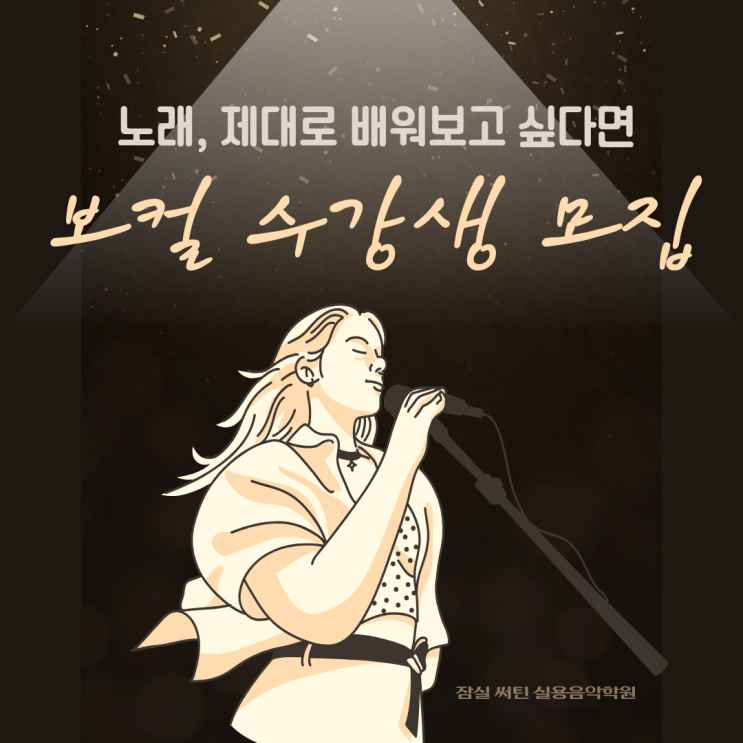 안녕하세요, 잠실 써틴 실용음악학원입니다. 어느덧 따뜻한 4월, 완연한 봄이 찾아왔네요. 햇살도 부드러워지고, 바람도 살랑살랑 불어오는 요즘, 괜히 콧노래가 나오고, 자연스럽게 노래를 부르고 싶어지는 계절 아닌가요? 이렇게 날씨가 좋아지는 순간에는 새로운 무언가를 시작해보고 싶은 마음이 들기도 합니다. 그 시작이 ‘노래’라면, 더없이 즐겁고 특별해질 수 있겠죠. 써틴 실용음악학원 보컬 레슨의 강점 누구든지, 처음에는 어렵고 막막할 수 있습니다. 하지만 제대로 된 방향과 방법만 알게 된다면 노래 실력은 충분히 좋아질 수 있습니다. 써틴 실용음악학원은 그 과정을 쉽고 확실하게 만들어드립니다. ✔️ 1:1 개인 맞춤 수....... <img src="https://blogthumb.pstatic.net/MjAyNjA0MjFfNzEg/MDAxNzc2NzM4ODg2MDM2.GIn14YIkVtRUUsGWXiI2Vrr7b-ZeGazBok-zG3ww52Ig.TONjpS_NWpRSKr-JbDh5kcQfJKPoaDxfxaOHcz7cK1cg.PNG/1.png?type=s3" />