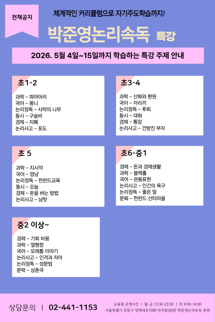 명일 박준영논리속독 5월 2, 3주 논술특강 주제 안내