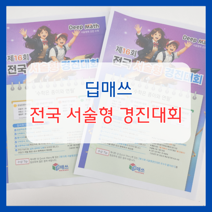 안녕하세요, 거제시 상문동 초등중등 맞춤형 수학 전문 『한입수학』 서주량 원장입니다. 올해도 어김없이 딥매쓰에서 전국 서술형 경진대회를 실시합니다. 어느 덧, 16번째를 맞이하였죠! 한입 수학에서도 꾸준히 참여하면서 수상을 하는 친구들도 있었습니다. 이번 대회에서는 조금 더 심혈을 기울여서 좋은 성과를 얻기를 희망합니다. 우리 한입 친구들이 수상하는 기쁨을 느껴보면 좋겠네요! 우선 한입 수학 게시판에 딥매쓰 전국 서술형 경진대회 안내를 부착했습니다. 전국 서술형 경진대회 심사포인트 ✔️일일학습 계획표 세우기 ✔️수학용어, 핵심개념 적기 ✔️풀이과정 정리 ✔️수학공식, 유사문제 표현 ✔️보충 학습 자료 활용 한....... <img src="https://blogthumb.pstatic.net/MjAyNjA0MjJfMTky/MDAxNzc2ODYxMzY5ODIz.aI-4HGErFupxaxMWdkhA2YISaWT-THuzgdVvZiIVIUYg.mZtjYBTCyt1FamO3snVDKv2DSEdtYr5Ym_Y0CBMICLUg.PNG/%C1%A6%B8%F1_%C3%DF%B0%A1_%2827%29.png?type=s3" />
