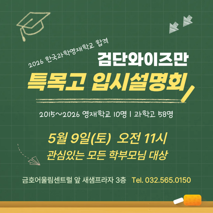 안녕하세요 검단와이즈만 영재학교를 비롯한 특목고 입시설명회 안내입니다 영재학교 과학고, 특목고 입시는 검단와이즈만에서! 13년간의 검단와이즈만의 통계자료는 누구도 흉내낼수 없습니다 변화되는 고입 입시 상황에 매번 대응하고 전략적으로 접근해온 노하우를 함께 나누고자 합니다 영재학교, 과학고, 자사고 등 특목고 진학에 관련된 현황과 전략을 함께 나누고 궁금하신점 풀어드리겠습니다 감사합니다 ps. 수학 과학 모두 정규 교육과정에 해당하는 교재로만 학습하는 것은 기본 전략에서 어긋납니다 특목고 입시에 걸맞는 교재와 교수-학습방법이 반드시 필요합니다 올바른 학습 전략! 꼭 오셔서 알아가셨으면 좋겠습니다 센터 위치....... <img src="https://blogthumb.pstatic.net/MjAyNjA0MjFfMjkx/MDAxNzc2NzY3MzU5Mzcy.xGADbGZstC6Fkx-hJmGzheEXhzlpujqkokmX6aSh87Ag.wexcCr0tX5QkVkcnrPIrLLH6kXw_xyxAIKqw6Zy-FjEg.PNG/1.png?type=s3" />