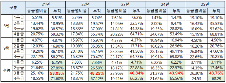 수능 최저 또는 정시를 준비하는 재원생의 영어 학습시간 배분을 상담하다가 만든 자료입니다. 아래의 표는 2021년부터 2025년까지 평가원의 6평 9평 수능의 1등급부터 4등급까지의 비율과 누적 비율을 만든것입니다. 여기에서 더 주의 깊게 볼 내용은 최종 결과물인 수능의 3등급까지의 누적 비율입니다. 21년도 53%에서 25년 43%까지 인데 다시 말하면 수능을 본 학생의 절반정도는 3등급 이내의 성적을 받는거죠. 25년도 가장 어려웠던 수능 영어도 1등급과 2등급의 비율만 낮지 3등급의 누적 비율을 본다면 44%이고 4등급까지의 누적 비율은 68%로 다른 년도 보다 높습니다. 정시를 준비하는 학생이고 최상위권이 목표가 아니라면 영어의 학....... <img src="https://blogthumb.pstatic.net/MjAyNjA0MjBfMjQ4/MDAxNzc2Njg1Njk2Mzgz.yn9flg_ArVVU0iwNboD9OxcPCihYi8cDiWsE3I0Ujrcg.3Akc-kppaBbrfxFemB_9C8OELFOe52t0DMlAjm7ylzog.PNG/image.png?type=s3" />