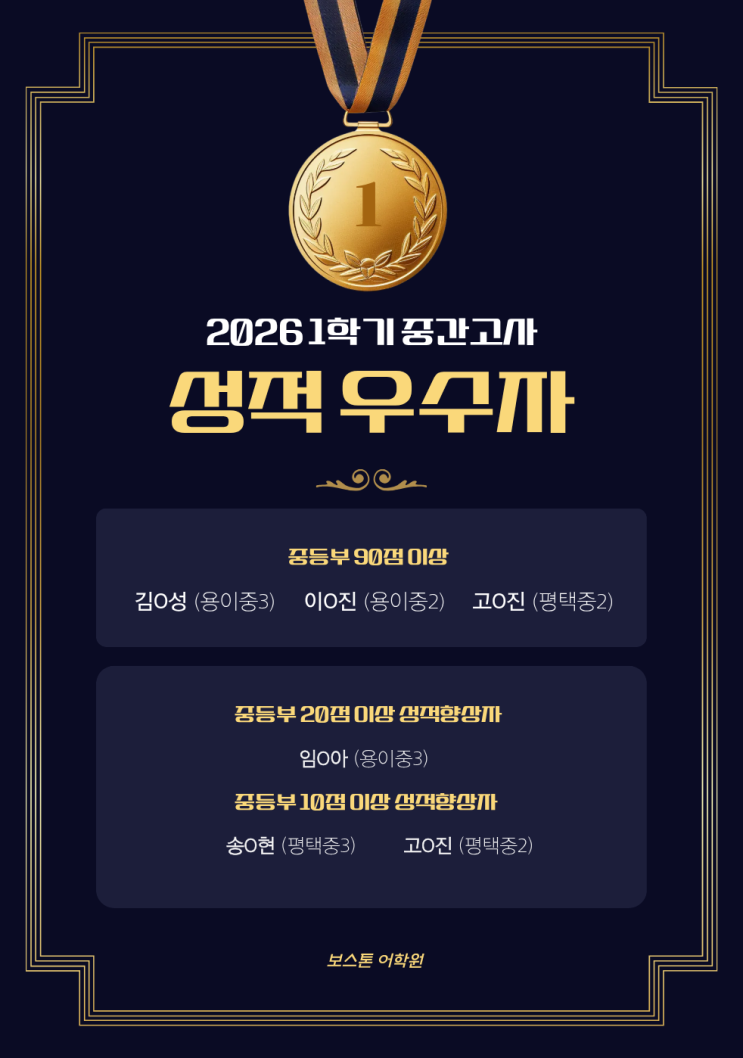 안녕하세요, 보스톤어학원입니다! 2026년 1학기 중간고사 결과가 나왔습니다. 열심히 달려온 우리 학생들의 노력이 빛나는 시간이에요. 이번 시험에서 특히 뛰어난 성과를 거둔 중등부 학생들을 소개합니다! 수상한 모든 학생들, 정말 수고 많았어요! 앞으로도 보스톤어학원은 학생 한 명 한 명의 성장을 위해 함께하겠습니다. 다음 시험에서도 좋은 결과 기대할게요. 우리 함께 더 높이 올라가 봐요! 무료 레벨테스트 & 상담 신청 평택 용이동 보스톤어학원 초, 중등부 상시 모집 중 010-2705-2287 <img src="https://blogthumb.pstatic.net/MjAyNjA0MjlfMjc0/MDAxNzc3NDU2MDE1ODE0.S6UL0m1TrZorgD9BVvrKaLvFdwWYjRUhlJrEgdyGEs8g.HQLMfS7wMFMRh8gicmNqco1L20VKg48Xw2TO0GDGuwkg.PNG/%C1%A6%B8%F1%C0%BB_%C0%D4%B7%C2%C7%D8%C1%D6%BC%BC%BF%E4..png?type=s3" />