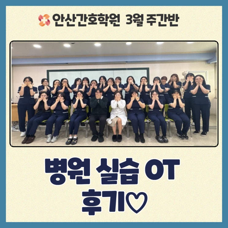 안녕하세요, #안산간호학원 입니다. 안산에서 간호조무사 자격증을 준비하시는 분들을 위해 오늘은 병원 실습 OT(오리엔테이션) 후기 포스팅을 진행합니다! 저희 안산간호학원은 병원 실습 전 감염병 예방 교육 및 주의 사항 등 사전 OT를 실시하여 보다 수월하게 실습을 하실 수 있도록 체계적으로 교육하고 있습니다. 실습 전 꼭 알아야 할 핵심 포인트 1. 적극적인 자세가 가장 중요 모르면 바로 질문하기 눈치 보지 말고 배우려는 태도 2. 기본적인 위생 관리 철저 손 위생, 마스크 착용 감염 예방이 최우선 3.단순 업무도 경험이다 침상 정리, 물품 정리 등도 실제 병원 시스템을 이해하는 중요한 과정 특히 요즘은 병원에서 실습생이....... <img src="https://blogthumb.pstatic.net/MjAyNjA0MTRfNzMg/MDAxNzc2MTMxNzc2NjQx.4uX7Z9JKsmFyntfjezoXcvFOvxaGTPYtNIp1nXZ9MqAg.11rTSEDuirLo1VrQOYw6-BBg7hswltwqCxf9i-ECP7Ug.JPEG/%C1%A6%B8%F1%C0%BB_%C0%D4%B7%C2%C7%CF%BC%BC%BF%E4_%2868%29.jpg?type=s3" />