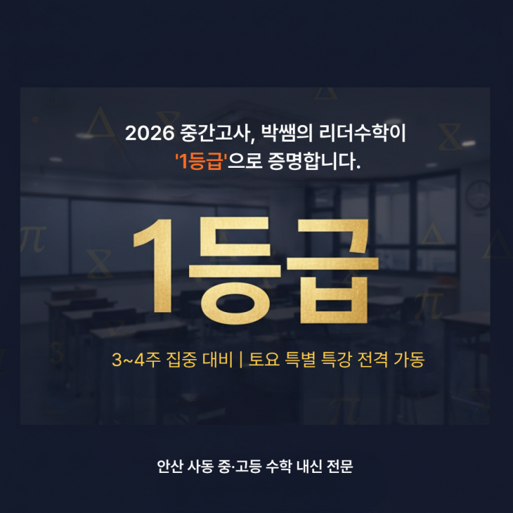 안녕하세요, 박쌤의 리더수학입니다! 새 학기의 설렘이 채 가시기도 전에 벌써 우리 아이들의 첫 단추를 결정짓는 '중간고사' 시즌이 다가오고 있습니다. 중학교 진학 후 첫 시험을 치르는 아이들부터, 대입의 직접적인 지표가 되는 고등부 학생들까지 모두가 긴장하는 시기죠. 수학은 단순히 '많이 푸는 것'보다 '어떻게 메우느냐'의 싸움입니다. 박쌤의 리더수학에서 준비한, 감점 없는 1등급을 위한 [중·고등 중간고사 완벽 대비 전략]을 상세히 공유해 드립니다. 1. 시험 대비의 '골든 타임': 3~4주 집중 커리큘럼 수학은 '벼락치기'가 불가능합니다. 박쌤의 리더수학은 시험 3~4주 전부....... <img src="https://blogthumb.pstatic.net/MjAyNjA0MTZfMTc2/MDAxNzc2MzA1MDM1Mzc5.4UEms0YAY3U_fCIDoTT2aIRIYlV24XmbegcP-P3KFt0g.LlRHa3Y8IE4hulBjQxPHqFdYrSnYQIWzL8NsJbtTuawg.PNG/1.png?type=s3" />