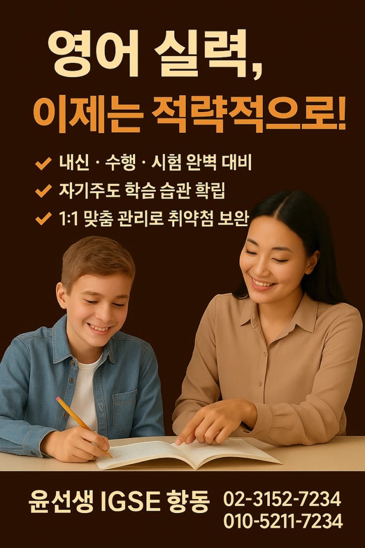 안녕하세요 .윤선생IGSE아카데미 향동입니다~ 날씨가 따뜻해지면서, 벚꽃과 함께 중간고사 기간이 찾아왔습니다 오늘은 윤선생IGSE향동의 향동중2학년 학생들을 위한 1:1 수준별 중간고사(1,3과)준비 과정 및 주요 내용을 자세히 말씀드리려고 합니다. 윤선생IGSE향동의 향동중2학년 중간고사 준비 과정 1. 어휘학습 - 해당범위의 어휘를 선생님의 지도하에 발음,의미,비슷한말,반댓말등 꼼꼼히 익히고 암기합니다. 셀프테스트 후 다시 선생님과 구두테스트를 거쳐 완벽하게 익힙니다. 2. 본문해석 - 해당범위의 본문 내용을 암기한 어휘를 바탕으로 선생님과 꼼꼼하게 해석 분석합니다. 해석이 완벽하게 된 후 암기는 필수 입니다. 3. 문법익히....... <img src="https://blogthumb.pstatic.net/MjAyNjA0MTJfMTE5/MDAxNzc2MDAyODc4NTcy.Zh54ohslgkpPUmlITNvgGcXtJW6ErPfabKJy_0xiiTYg.CWwikFThnfeR8a_wEKGHhmqV_zBLP1MAiNOUufs20yUg.JPEG/3B4C0DC5%A3%ADFAC2%A3%AD4985%A3%AD9529%A3%ADC6FF894FA7F6.jpg?type=s3" />