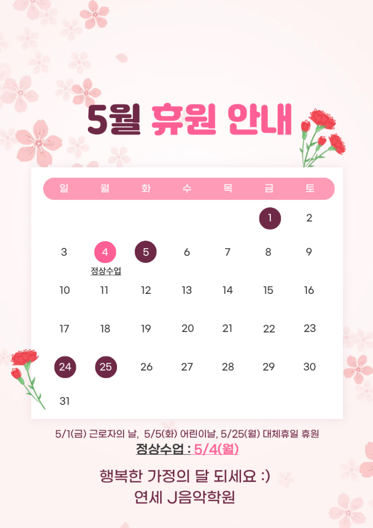 안녕하세요 연세 J음악학원입니다 5월 휴원안내 드립니다 5/1(금) 근로자의 날, 5/5(화) 어린이날, 5/25(월) 대체휴일(부처님 오신날)로 휴원합니다. 정상수업 : 5/4(월) 일정에 참고바랍니다. 행복한 가정의 달 되세요♥️ 감사합니다 :) #신원동피아노 #신원동음악학원 #신원동피아노학원 학원 인스타그램도 구경오세요~~ https://www.instagram.com/yonsei_j.musicacademy?igsh=MW4ydGVpOGQxdjF1YQ== 연세 J음악학원 010-7358-4216 ⬆️⬆️⬆️⬆️⬆️⬆️⬆️ 교육상담은 수업중에는 어려우니 위의 학원번호나 아래 카카오톡 채팅으로 문의주세요 ....... <img src="https://blogthumb.pstatic.net/MjAyNjA0MjBfNzQg/MDAxNzc2Njg1MDYxMDA5.zLszkkgY4Z5wQKKrW1VOlaroqaUEZEAmN3S40ouBvz0g.yVlsykdYJzGnqQsByUQ70o3Fz5cj4vVinbQLiDYk8-0g.PNG/1776677621636.png?type=s3" />