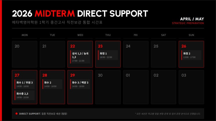 안녕하세요, 메타백영어학원입니다. 26년 1학기 본격적인 화정영어내신 지필고사 기간으로 직전보강관련 스케줄 및 커리큘럼 안내드립니다. 중간고사 직전, 점수를 만드는 건 ‘출제 방식’에 맞춘 실전 훈련입니다 아이들이 시험이 가까워질수록 더 불안해하는 이유가 있습니다. 공부를 안 해서가 아니라, 공부한 내용이 시험 점수로 “그대로” 이어지지 않는 경험을 반복하기 때문입니다. 이 시기엔 단어·문법을 추가로 더 외우는 것도 필요하지만, 성적을 실제로 끌어올리는 핵심은 따로 있습니다. 바로 예상문제·기출문제로 ‘출제 방식과 풀이 방식’을 익히는 것입니다. 내신은 같은 범위를 공부해도 학교마다 문제를 만드는 방식이 달라....... <img src="https://blogthumb.pstatic.net/MjAyNjA0MjFfMjAg/MDAxNzc2Nzc0MjA4MzY4.Nbiv8DRpCfGwEPu7SC_YTptSDi5xTXs8yvBGYaehXvUg.-kzW79Q3dC2TZ3ITMS_LPMRKeCDR9WZ7gQWeZLvlW0sg.JPEG/%C1%F7%C0%FC%BA%B8%B0%AD_%BD%C3%B0%A3%C7%A5.jpg?type=s3" />