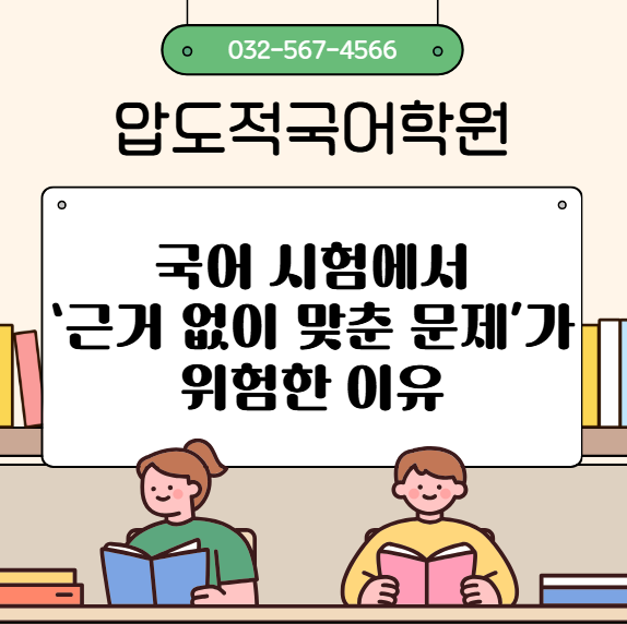 안녕하세요. 청라국어학원 압도적국어학원입니다. 시험을 보고 나면 “이번에 국어 잘 봤어요” 라고 말하는 학생들이 있습니다. 하지만 조금 더 자세히 들어보면, 맞힌 문제 중 상당수가 “그냥 느낌상 맞은 것 같아서 골랐다”는 경우도 적지 않습니다. 이때 많은 분들이 결과가 좋으니 괜찮다고 생각하지만, 실제로는 근거 없이 맞춘 문제일수록 더 위험한 신호일 수 있습니다. 국어 시험에서 중요한 것은 단순히 정답을 맞히는 것이 아니라, 왜 그 답이 맞는지 설명할 수 있는지입니다. 근거 없이 맞춘 문제는 겉으로는 정답이지만, 실제로는 실력이 쌓이지 않은 상태입니다. 이런 경우 다음 시험에서는 같은 유형의 문제를 틀릴 가능성이 매....... <img src="https://blogthumb.pstatic.net/MjAyNjA0MTZfMjk1/MDAxNzc2MzAzNjg1MTI1.1RZvoCJdt1WjvUA5c21dwb7x37qSJq27dZR3T-L7Buwg.jWVroE7dK9ymlViVXF65nZGNT4UcYpfsE-6z1Wp8AqEg.PNG/image.png?type=s3" />