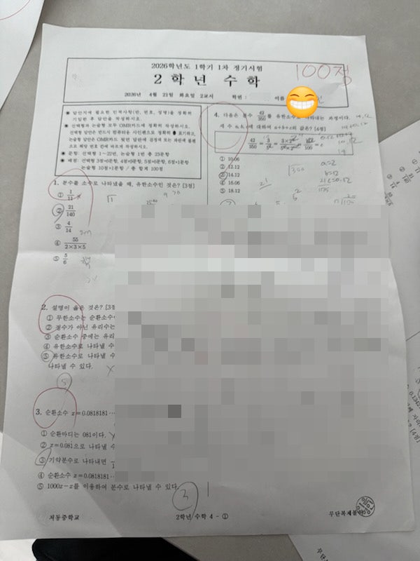 중간고사 시즌이 되면 원장으로서 늘 두 가지 감정을 동시에 마주합니다. “역시, 이렇게 성장했구나”라는 확신과, “아, 여기서 조금만 더 잡아줬더라면” 하는 깊은 아쉬움입니다. 오늘은 그 뜨거웠던 현장의 두 장면을 학부모님들과 나누고 싶습니다. 장면 1. 4년의 시간은 배신하지 않습니다 — 저동중 100점의 의미 오늘 시험에서 저동중 수학 100점이라는 완벽한 결과를 가져왔습니다. 이 아이는 초등학교 5학년 때 처음 매쓰플랜의 문을 두드렸습니다. 처음부터 수학 천재였던 것은 아닙니다. 사춘기의 입구에서 집중이 흐트러지던 시기도 있었고, 높은 심화의 벽 앞에서 포기하고 싶어 하던 순간도 분명 있었습니다. 하지만 단 하나, 변....... <img src="https://blogthumb.pstatic.net/MjAyNjA0MjFfMjc5/MDAxNzc2NzY4MDg3ODY5.zO1Strl-Ol81g_kU-7gCNAF_12YltQTQqWh-xtbdVacg.hALB7h4uy4qVoD40lIT4XtmMzPyD4mlhDuUJ5B8jyUog.JPEG/KakaoTalk_20260421_193444444.jpg?type=s3" />