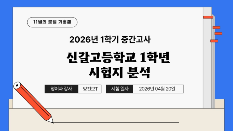 신갈고등학교 1·2학년 영어 중간고사 분석 2026년 1학기 중간고사, 신갈고 영어 내신은 이렇게 출제되었습니다 2026년 1학기 중간고사가 마무리되었습니다. 11월의 로렐학원에서는 이번 신갈고등학교 1학년, 2학년 영어 시험지를 분석하며 학생들이 실제 시험에서 어떤 부분에서 강점을 보였고, 어떤 부분에서 어려움을 느꼈는지 꼼꼼하게 확인했습니다. 이번 신갈고 영어 시험은 학년별로 특징이 분명했습니다. 1학년 영어는 외부지문과 고난도 유형에서 변별력이 강하게 나타난 시험이었고, 2학년 영어는 지문 변형이 크지 않은 대신, 정규 교재와 수업 자료를 얼마나 정확하게 준비했는지가 중요한 시험이었습니다. 즉, 학년별 출제 방식은 달....... <img src="https://blogthumb.pstatic.net/MjAyNjA0MjRfMjI5/MDAxNzc3MDM5MDQ5Nzc5.RVj9rlnX3A5NKnW7CgfmqDQfX9Ipc167WUBO3MLID0kg.8YqnZRnQrb0Xj_wBZJPrEaO-2XZ9IkatP39g5SxZJpgg.PNG/image.png?type=s3" />