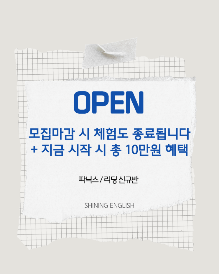 학부모님들의 문의 증가로 신규 클래스를 오픈했습니다 이번 파닉스반과 리딩 기초반에서 함께 시작할 친구들을 모집합니다. 특히 처음 영어를 시작하는 시기에 어떻게 접근하느냐에 따라 이후 학습 속도와 안정감이 크게 달라집니다. 샤이닝 잉글리시는 단순히 읽는 것을 넘어서 소리부터 제대로 잡고 읽기가 말하기와 쓰기로 연결되는 수업을 진행하고 있습니다. ✔️ 공식 보컬 트레이닝 코칭 프로그램 기반 소리 훈련 ✔️ 원서읽기 → 말하기 → 쓰기로 이어지는 원소스 리딩 ✔️ 즐겁게 문법을 익히는 리듬 그래머 ✔️ 영어 원서 2000권 + 르네상스러닝 기반 독서 시스템 시작이 다르면 이후 중고등, 그리고 입시까지의 결....... <img src="https://blogthumb.pstatic.net/MjAyNjA0MTJfMjky/MDAxNzc1OTcxMzY5MjU3.LF4u5YoQUP76c0v2TgsYzP4wEkJGoClVQPiOw9W2HtIg.FtkgaSu3926M3v6MVmge7KVoTaL9aYS7D-DIsasD8Ckg.PNG/900_1_20260411_184121_0000.png?type=s3" />
