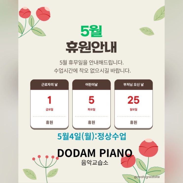 5월 가정의 달을 맞아 학부모님 가정에 사랑과 행복이 넘치시기를 바랍니다~♡ 5월 4일(월): 정상수업 ✔️ 5월1일(월):근로자의 날 휴원 ✔️5월4일(화):어린이날 휴원 ✔️5월25일(월):석가탄신일 휴원 수업시간 착오 없으시길 바랍니다. #파주문산 #문산피아노 #소수정예피아노 #개인지도전문 #취미부터전공까지 #도담피아노 #음악교습소 <img src="https://blogthumb.pstatic.net/MjAyNjA0MjVfMTI5/MDAxNzc3MTA0Mjg4MDc4.oaYpevGBdj6JN_nPLIAvEeWqB0ksEF2XISCRCflPCXog.YZ5I5qwLlseF9Ki6wszGc4ibRL-Y_mzvQLGDNzKyTPkg.JPEG/900_CYMERA_20260425_164617.jpg?type=s3" />