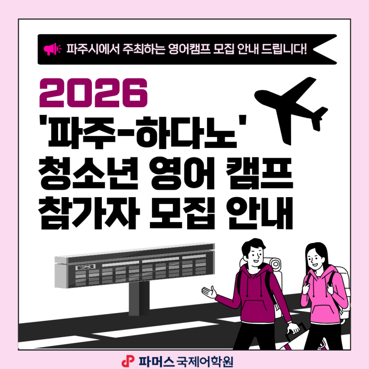 #파머스국제어학원 #운정브랜치 #즐거움이실력이되는곳 안녕하세요, 파머스국제어학원 운정브랜치입니다! 다가오는 여름방학, 우리 아이에게 영어 실력 향상은 물론 일본 자매도시 친구들과 교류하며 넓은 세상을 경험할 수 있는 최고의 기회를 선물해 주세요. '파주시에서 주관하는' 2026 파주-하다노 청소년 영어 캠프 & 일본 문화 탐방 참가자 모집 소식을 전해드립니다! [2026 파주-하다노] 청소년 영어 캠프 & 일본 문화탐방 이번 프로그램은 파주 캠퍼스에서의 원어민 영어 캠프는 물론, 일본 하다노시를 직접 방문해 현지 친구들과 우정을 나누는 글로벌 리더 양성 프로젝트입니다. 특히, 이번 캠프에 도전하는 파....... <img src="https://blogthumb.pstatic.net/MjAyNjA0MTdfMTA5/MDAxNzc2NDIwNjEyNDUy.u8w9uTjFA3EoqR26uHwDfjRcF6RW7ugEPUY5CX1DrEUg.veMORaj8PxqhBEIUKtQNvIQ--i_DBc6gO-ISPaqG0O8g.PNG/%BF%B5%BE%EE%C4%B7%C7%C1_%C7%A5%C1%F6.png?type=s3" />