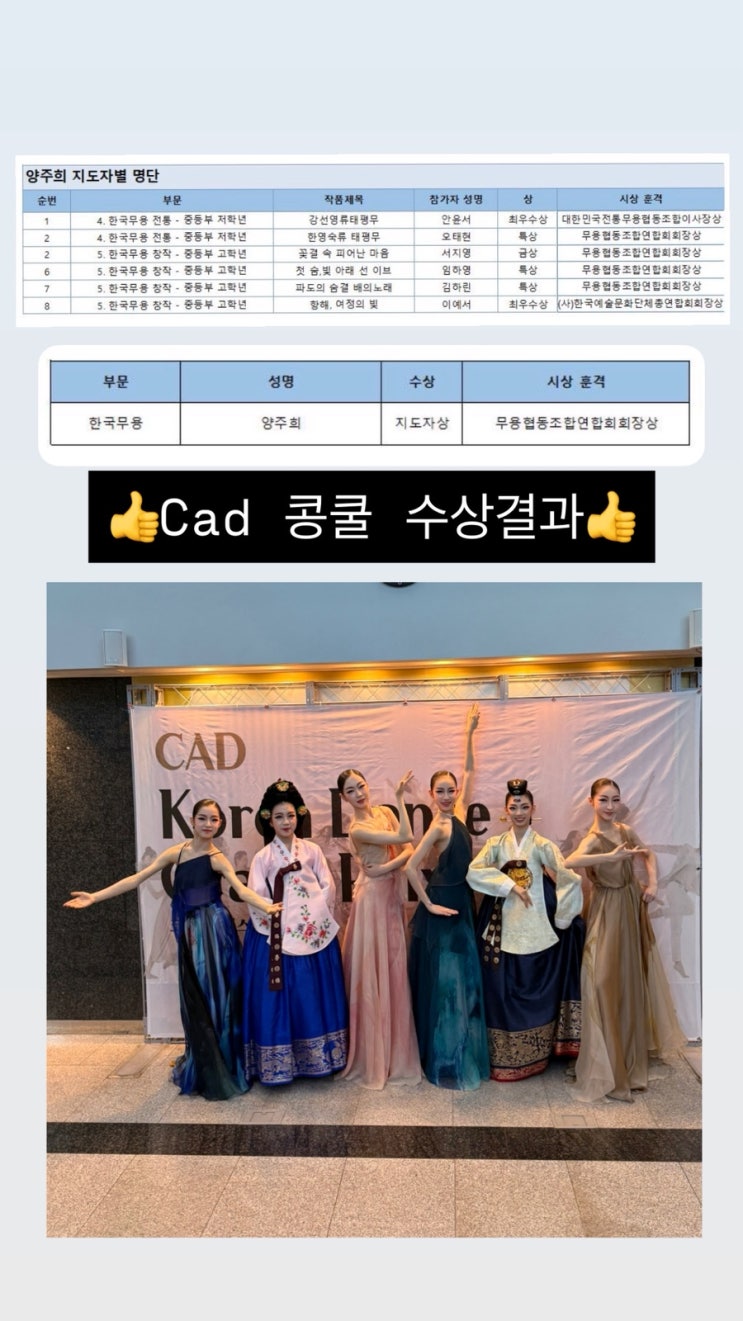 Cad 콩쿨 수상결과 중등부 최우수상한국무용,운정,파두무용학원