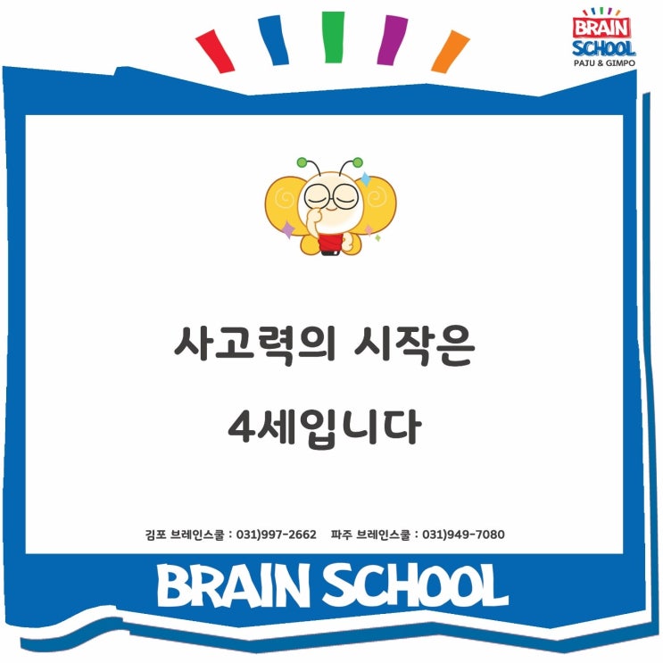 안녕하세요. 브레인스쿨 김포·파주센터입니다 많은 부모님들께서 이런 질문을 하십니다. “4세는 아직 어려서 수업이 의미가 있을까요?” 하지만 사실 4세는 가장 중요한 시작 시기입니다. ✔ 4세 수업은 ‘공부’가 아니라 ‘기초’입니다 브레인스쿨은 5세부터는 논리수업 + 창의수업으로 진행되지만 4세는 그 이전 단계인 ‘기저활동’ 중심 수업으로 이루어집니다. 기저활동이란 생각할 수 있는 힘의 바탕을 만들어주는 활동입니다. ✔ 70분 동안 이렇게 수업이 진행됩니다 4세 수업은 주 1회 70분 동안 ✔ 수 (기초 개념 경험) ✔ 언어 (이야기 듣고 표현하기) ✔ 과학 (직접 관찰하고 느끼기) ✔ 창작 (만들고 표....... <img src="https://blogthumb.pstatic.net/MjAyNjA0MThfMjQg/MDAxNzc2NDg5Nzg3OTU3.JXI-xSR7SGZECIDuek-7SZMBe5JrIoSzXwCZ2GvoS7og.OWn_mCPCbyP3jpmfAJiQloQR-o2V2vqbE1MsRkoUBncg.JPEG/KakaoTalk_20260418_125831718.jpg?type=s3" />