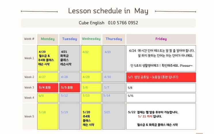 4월 마지막주는 내신 대비 초등 저학년은 새로운 리딩책으로 초등 고학년은 초등 그래머 마무리하기 각 클래스마다 계획데로 촥촥 잘 진행되고 있네요. 학생 여러분 모두 모두 고마워요 5월은 반가운 ? 빨간 날이 좀 많네요. 5/1 노동절로 26년부터 법적공휴일로 지정되어 5/5 일까지 휴원입니다. 잘 짜여진 학습플랜으로 더욱 알차게 즐겁게 쏼라쏼라 해 보아요 ~^^ 노베이스 및 시작하는 영어를 해야한다면 어려워하지 마시고 바로 문의부터 ! <img src="https://blogthumb.pstatic.net/MjAyNjA0MThfOSAg/MDAxNzc2NTE0MzUyMDk5.-wOwycEqz3wBXt17l6XEHESfPHotC-lkNQ_6M-CHQjog.Sij7K1_kqblUZFCSNp8WkvmEadCsbeOY0gFdpSLsA64g.JPEG/IMG%A3%DF1124.jpg?type=s3" />