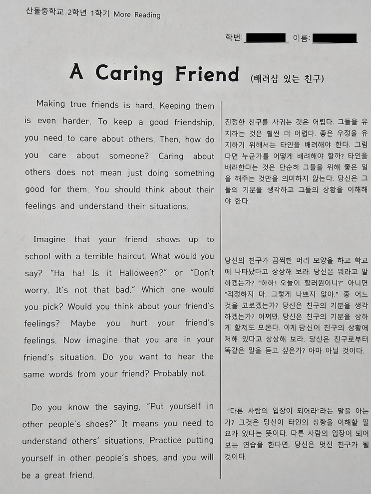 안녕하세요. 중간고사가 다가오면서 점점 마음이 바빠지는 시기죠. 모두들 학원이든, 혼자서든 교과서 문제집이랑 기출문제 열심히 풀면서 준비하고 있을 거라고 생각합니다. 그런데 막상 외부지문 나오면 살짝 막막해지는 친구들도 있죠. “이건 어디서 봐야 하지?” 싶은 순간들, 한 번쯤 있었을 겁니다. 그래서 그런 친구들을 위해 딱 도움이 될 만한 꿀자료를 준비했습니다. 낯선 지문에 미리 익숙해지는 연습, 생각보다 점수 차이 꽤 크게 만듭니다 1. 다음지문의 주제는 ? ① It is important to always make your friends laugh. ② Friendship becomes stronger when you give your friends many gifts. ③ True friendship requires und....... <img src="https://blogthumb.pstatic.net/MjAyNjA0MjFfMTQ5/MDAxNzc2Nzc4NjY3Nzc2.up8HAUGQaZ32epVoY-89y8M1t44XOkzKi_0wRNP2PQIg.GVs8K3OfF_miQ8lQ5JooJw4OhH5aTr36VDItVaRuOPQg.PNG/%BF%B5%C0%B1%C0%CC_%C0%CC%B8%A7%B0%A1%B8%AE%B1%E2.png?type=s3" />