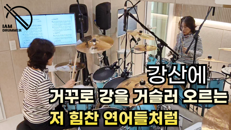 안녕하세요, 파주 운정 실용음악학원 아이엠드러머입니다. 환절기 일교차가 큰 요즘, 감기 걸리지 않도록 건강관리 잘 하시고, 따뜻한 물 자주 챙겨드세요. 오늘은 성인 취미반 드럼 레슨 영상을 소개해 드립니다. 강산에-'거꾸로 강을 거슬러 오르는 저 힘찬 연어들처럼' 이 곡은 삶의 흐름 속에서도 자신의 방향을 잃지 않고 나아가는 사람들의 의지를 연어의 모습에 비유하여 표현한 노래로 희망과 용기를 전달하는 메세지가 있는 곡입니다. 드럼 연주에서는 미디엄 템포의 곡으로 반복적인 8비트 리듬위에 자연스럽게 이어지는 16분음표 필인 연결이 중요한 포인트입니다. 8비트 리듬의 킥 패턴을 안정적으로 유지해야 전체적인 그....... <img src="https://blogthumb.pstatic.net/MjAyNjA0MjFfMTkw/MDAxNzc2NzU4NTE5NDQy.pWBGMJcWfabqYM7btnlXpBlxSBsL0-vLELAEkp5fzH4g.A_rP21j_mLCChR1LWWawBUUbLqWJ2_xLLLQKGBI0LNsg.PNG/%B1%E6%C8%AB%B1%DD_%B0%C5%B2%D9%B7%CE%BF%AC%BE%EE_%BD%E6.png?type=s3" />