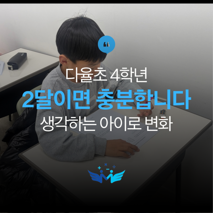 수학은 정답이 아닌 과정입니다. 지금부터 준비해야 중등때 어렵지 않아요 안녕하세요, 플라이매쓰 날개쌤이에요~ 초등 수학 100점 우리 아이 통지표에 찍힌 점수를 보면 '우리 아이가 수학은 곧잘 하는구나' 싶어 안심이 되곤 하죠. 하지만 엄마들의 진짜 고민은 아이가 고학년이 될수록 중학교 입학을 앞둘수록 깊어집니다. "지금처럼 답만 툭툭 적어도 괜찮을까?" "문제집은 다 맞는데 정작 서술형은 왜 어려워하지?" 오늘은 플라이매쓰에서 4학년 친구가 두달만에 단순히 답을 맞추는 모습에서 생각하는 수학! 공부 습관이 바뀌고 수학을 좋아하며 바뀐 변화에 대해 보여드리려 합니다 1. 답만 맞으면 끝? 아....... <img src="https://blogthumb.pstatic.net/MjAyNjA0MjFfMjcg/MDAxNzc2Njk5NDQyMDU5.3x_zJ1SyW-e-AJ6Oos7uhLzjyIZoT96IlFNiVYbqYXcg.EzNS_FbTsOHcXKvoN14cZ0fdHTbqn2niquteajxOzogg.PNG/%C7%CF%B4%C3%BB%F6%B0%FA_%C8%B8%BB%F6_%B8%F0%B4%F8%C7%CF%B0%ED_%BD%C9%C7%C3%C7%D1_%C0%FC%B9%AE%C0%FB%C0%CE_%BA%F1%C1%EE%B4%CF%BD%BA_%BB%E7%C1%F8_%C8%B0%BF%EB_%B5%F0%C0%DA%C0%CE_%B7%B9%C0%CC%BE%C6%BF%F4_%C5%DB%C7%C3%B8%B4_%C0%CE%BD%BA%C5%B8%B1%D7%B7%A5_%C4%AB%B5%E5%B4%BA%BD%BA_%285%29.png?type=s3" />