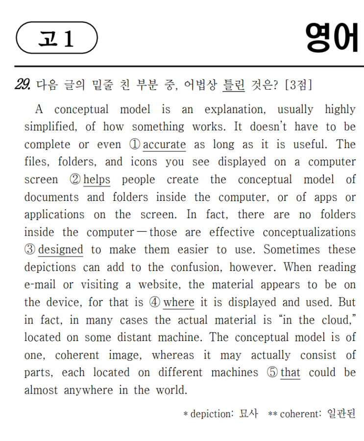 안녕하세요, 이현고 1학년, 양정여고 1학년 영어 중간고사 시험범위 중에서 26년 3월 모의고사 고1 영어 29번 개념 모델(Conceptual Model) 지문 내용이 내신 준비에 너무 어렵다는 학생들의 의견이 많아서 도움이 되고자 공감쌤 스타일대로 정리해봅니다. 먼저 '개념모델'이 뭔지 배경지식부터 설명하고, 교육청에서 준 답지의 한글 해석을 어떻게 의역하면 좀 더 수월해지는지 자세히 설명해보겠습니다. 1. Conceptual Model이란? 어떤 것이 어떻게 작동하는지 "이해하기 쉽게 설명해 주는 방식" 또는 "머릿속 설계도" 특징: 완벽하거나 정확(Accurate)할 필요는 없다! 오직 사용하기에 유용(Useful)하기만 하면....... <img src="https://blogthumb.pstatic.net/MjAyNjA0MjFfMTc2/MDAxNzc2NzcwMDYwNDY1.KqE5zgvqSr_nu_EDcK3O21uHF-zkjvaXrtGzstTVHgEg.24xqz-S9cE014Ag4oXRMOk7N3Jb7_tIkyW8LTCdPozUg.PNG/image.png?type=s3" />