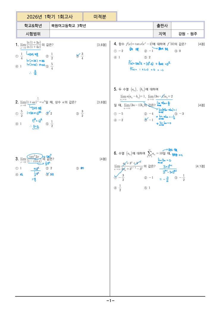 26년 북원여고3-1 미적분 1회고사 손풀이