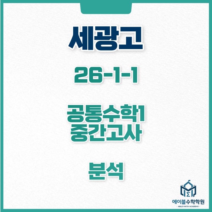 안녕하세요 에이블 수학학원입니다 세광고 26년 1학년 1학기 공통수학1 중간고사에 대해 말씀드리겠습니다. 총평입니다 대체로 무난하였으며, 뒤쪽 문항을 제외하면 평이했습니다. 2학년에 비하면 세광고 답게 변별이 잘되는 시험이라고 생각합니다. 15,16,17,18, 20번 정도가 변별을 위한 문제이며 15, 20번은 상대적으로 쉽고 16,17,18이 등급을 가르는 문제였습니다. 1등급(10%) 예상 컷트라인 : 16,17,18 틀리는 것 까지 예상합니다. 2등급 컷트라인은 큰 의미없고, 15,16,17,18,20 틀림 : 가능성이 있는 학생 5개 +알파 : 공부를 안한 학생이라고 생각이 듭니다. 개별문항 잠시 보겠습니다. 쉬운문항이나 처음으로 고민하게 되는 시점이라고....... <img src="https://blogthumb.pstatic.net/MjAyNjA0MjNfMTQ3/MDAxNzc2ODcwODYxODgy.NyycmsIXaQx676XE1Hr_ScLaxmSx8NNcmqN4qLdpKFsg.UgScr6Ju_32AQPEfgKMMMcwmBqegY_Nso0ip8jzna1kg.PNG/%C1%A6%B8%F1%C0%BB_%C0%D4%B7%C2%C7%D8%C1%D6%BC%BC%BF%E4._%282%29.png?type=s3" />