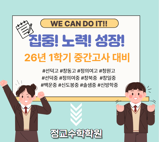 지금 정교수학은 1학기 중간고사 내신대비로 모든 학생들이 열정으로 불태우고 있습니다!!^^ 끈기있게 노력하는 우리 정교학생들 힘내세요~^^ <img src="https://blogthumb.pstatic.net/MjAyNjA0MTZfMjk4/MDAxNzc2MzQ0MDEyNTk1.x-Rf-s2Pm6Tm8-_qJZAf8bAIf2seV9_9mop5CBuCcjog.oVHWA2RWw8arM8KPbO-p5K33y3mkW3Z5cGoCE4kQ36og.PNG/image.png?type=s3" />