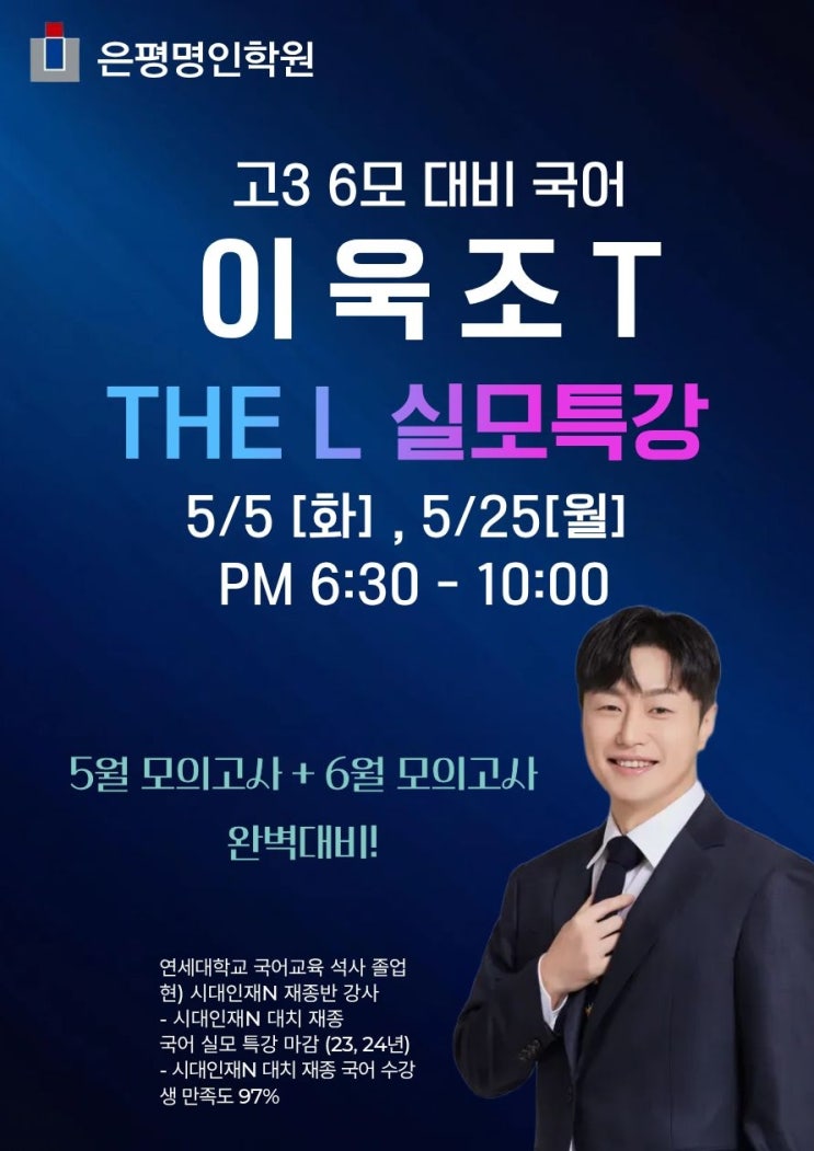 1차 : 5/5 [화요일] PM 6:30 - 10:00 2차 : 5/25 [월요일] PM 6:30 - 10:00 ○ 특징 - 현재 지문 이해 능력, 문제 풀이 능력, 시간 관리 능력 점검 - 점검 결과에 기반해 실모를 잘 볼 수 있는 최적화된 방향 제시 - 1차 실모 이후 개인별 약점 보완 클리닉 교재 - 학원에서 5월 9일 부터 수령 ○ 수업 방식 1교시 : 모의고사(80분) 2교시 : 최적화된 방향 제시(독서) 3교시 : 최적화된 방향 제시(문학) ○ 컨텐츠 - The L 6모 대비 01-02 - 약점 보완 클리닉 교재 3모대비 특강도 성공적으로 이끈 이욱조T의 두번째 6모대비 실모 특강 1차와 2차 한 번의 강의로 5모 대비까지 완벽하게! 1차와는 다른 2차 모의고사 내용! 1차, 2차 모두 수강하고....... <img src="https://blogthumb.pstatic.net/MjAyNjA0MjFfODMg/MDAxNzc2Nzc1MTgyOTk2.evrlj6poCN6XPdFYVXmuPMxtYKTJ13rLHRvgWua2AXsg.6bKULRntgIcxB9ijmPt7kvDfcyPOWVOrCoe9ZOxHpZQg.JPEG/%BB%E7%BA%BB_-_5.jpg?type=s3" />