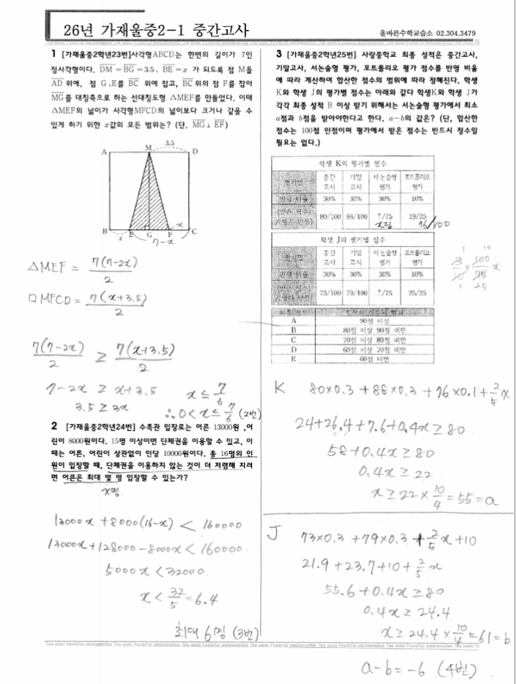 안녕하세요. 오늘은 가재울중학교의 중간고사가 있는 날입니다. 오늘은 첫째날로 수학을 보았습니다. 빠르게 저희 아이들에게 시험지를 입수하여 분석을 해보았습니다. 시험범위는 처음부터 부등식 활용까지가 시험범위 였습니다. 타학교들은 부등식 앞까지 인 학교들도 있고 부등식풀이까지 시험범위인 학교들도 많았는데 가재울중은 활용까지 다 포함을 시켜버렸습니다. 그럼 지금부터 분석을 해보도록 하겠습니다. 유리수와 순환소수 -총 7문항이 나왔습니다. 전체적으로 쉬웠습니다. 까다로운 문제라고 하면 6번문제가 소수 첫째자리부터가 아닌 50번째자리부터 100번째자리까지의 합이라서 문제를 잘 읽지 않았다면 오답이 나왔을 수도 있겠....... <img src="https://blogthumb.pstatic.net/MjAyNjA0MjJfMTgw/MDAxNzc2ODUxNjA5NzA1.mw_fk96gehLwnlqnNmRM1wM09s9VQzzUpNs0r7kqLsYg.Iptum3KgGA_s1_gP6GohFNbiSleOB0sjmbE3dNJJlIwg.PNG/image.png?type=s3" />