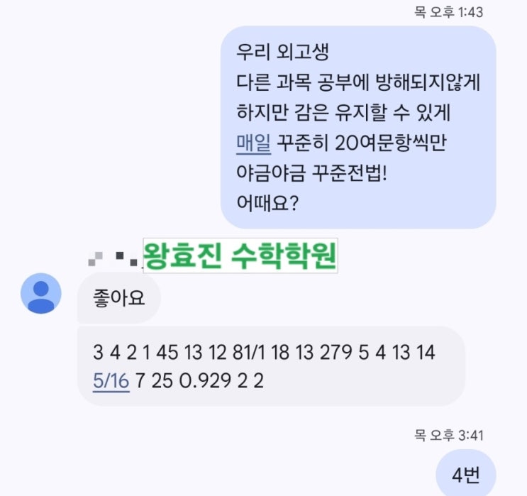 학부모님들과 상담을 하다 보면 가장 많이 하시는 질문 중 하나가 바로 이것입니다. “숙제는 얼마나 나오나요?” “숙제를 얼마나 관리해 주시나요?” 많이 시키는 학원이 좋은 걸까요? 결론부터 말씀드리면 숙제는 ‘양’보다 ‘방식’이 훨씬 중요합니다. 성실한 아이는 잘 해옵니다, 문제는 그 다음입니다 성실한 친구들은 숙제를 스스로 잘 해옵니다. 하지만 그렇지 않은 경우에는 분량만 맞추기 위한 숙제가 됩니다. 대충 풀기 찍기 베끼기 이렇게 해온 숙제는 결국 다시 틀리고, 다시 오답으로 학습해야 하는 상황이 반복됩니다. 시간은 썼지만 실력은 남지 않는 공부가 되는 것이죠. (엄마 눈 가리고 냐옹하기 숙제) 그래서 왕효진 수학....... <img src="https://blogthumb.pstatic.net/MjAyNjA0MTVfMjEx/MDAxNzc2MjI2MDM5NTM4.RSV7Af2ettQOrTE9T0purCrzaerScutPqNFrG4G9Sqgg.aGRx6U2S3CbbIxr_h6QNbeXmhuIUYv88dsJ_A0Ug3AYg.JPEG/900_1776226038772.jpg?type=s3" />