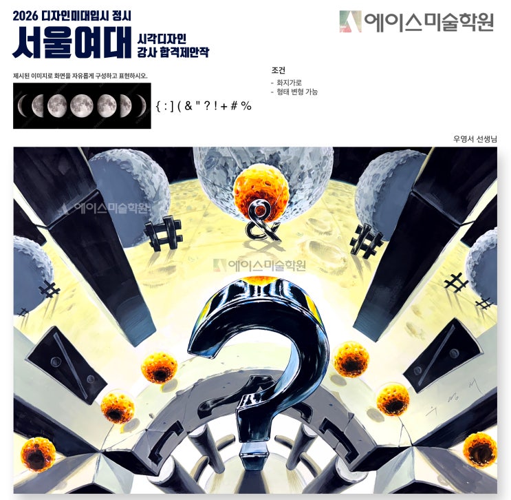 2026 디자인미대입시 정시 서울여대 시각디자인 기출문제 강사 합격제안작 우영서 선생님 서울여대는 산업디자인, 공예(컬렉터블디자인전공), 시각디자인 세 전공이 있습니다. 각 과마다 출제되는 제시물은 과 특색이 반영되며, 학생들은 각 과 특성을 충분히 이해하고 반영하여 구성을 전개해야합니다. 위 그림은 2026년도 정시 서울여대 시각디자인 기출문제로, 우영서 선생님께서 학생들을 위해 제작하면 합격제안작 입니다. 화면 정중앙 데칼코마니 레이아웃으로 반복,대칭 속 변화 를 이용한 구성입니다. 서울여대 시각디자인과는 평면적 이미지나 알파벳 등 문자나 기호가 함께 출제된적이 꽤 있는 학교입니다. 시각디자인 과라는 특성상 제....... <img src="https://blogthumb.pstatic.net/MjAyNjA0MjVfMjY3/MDAxNzc3MDkzMTM2MjI2.nf4wDoRs2TDfw9ClHwjIAJw6UMGZTYgdYLJc-7Zz2bQg.JlXFEVRU9wPL1PLhrLvR7jj6sBHbKCcqo_d9o61IEaIg.JPEG/2026_%BC%AD%BF%EF%BF%A9%B4%EB_%BD%C3%B0%A2%B5%F0%C0%DA%C0%CE_%B1%E2%C3%CA%B5%F0%C0%DA%C0%CE.jpg?type=s3" />