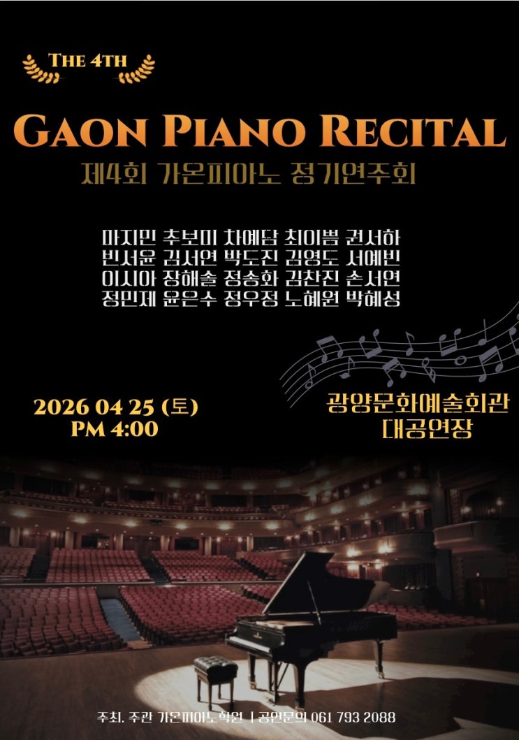 4월 25일 토요일, 가온피아노 제4회 정기연주회 우리 가온이들 정말 열심히 준비했으니 꼭 보러오세요 많관부❤️❤️❤️ <img src="https://blogthumb.pstatic.net/MjAyNjA0MThfMTAx/MDAxNzc2NTIxODExMzQx.v1BE77N-OzVA7FwDNgc_lYwEVhj-oPWtpXp8WjnqOksg.wY8TJpy3fRvHfkqjY6CagsQwxStVCIWnAbbI3M9npyQg.JPEG/IMG%A3%DF3242.jpg?type=s3" />